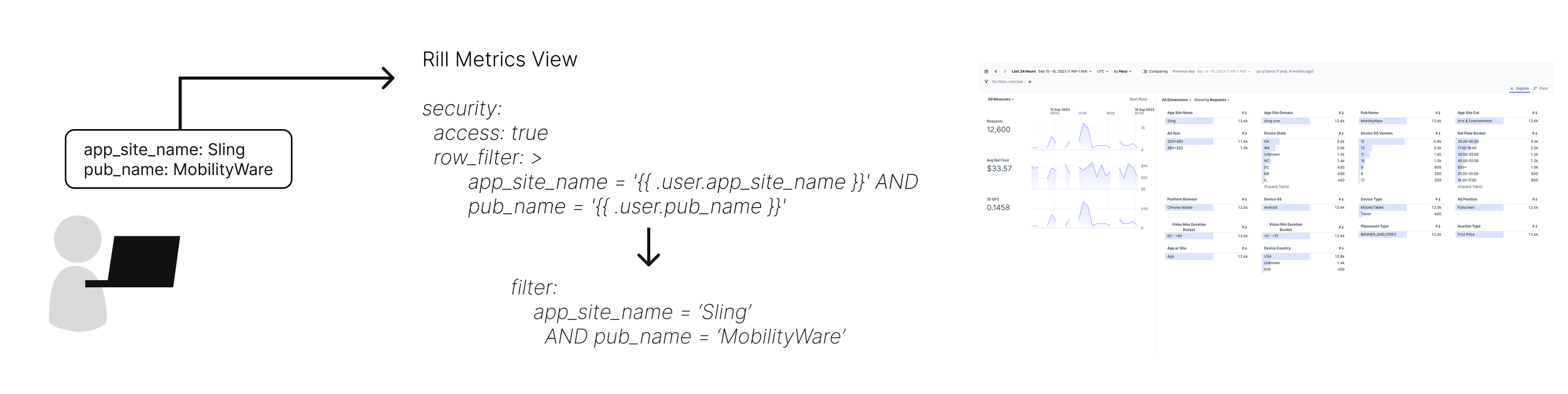 Unlike in the basic example, where we are using a default user attribute, here we are using custom attributes. In this example, we are passing app_site_name = Sling and pub_name = MobilityWare to provide a very specific view to an end user. Note that the other values in these dimensions are not visible. The variables can be defined in the front end of your application and passed to Rill during the iframe request. If you want to take it to the next level, you can add the `exclude` parameter to the metrics view security policy to remove those columns completely.